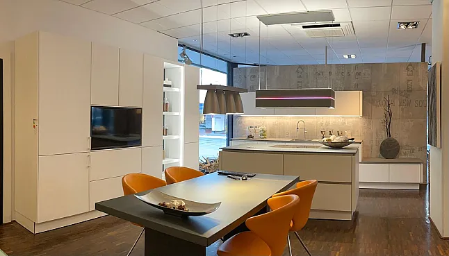 Achtung: Preis ohne TV Bildschirm, Tischgruppe und Backofen, in dieser Küche ist kein Backofen verbaut, kann auf Wunsch entsprechend geplant und eingebaut werden.