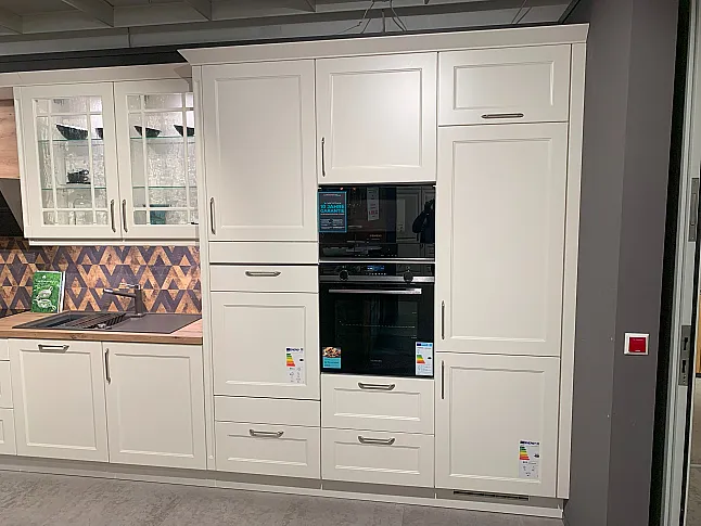 Musterküche Landhaus von Nobilia, Modell Chalet in Lack Magnolia matt, Arbeitsplatten in Dekor Eiche Artisan Nachbildung, inklusive aller Elektrogeräte, inklusive Armatur, Spüle mit Sink Drainer und Abfallsorter von Blanco