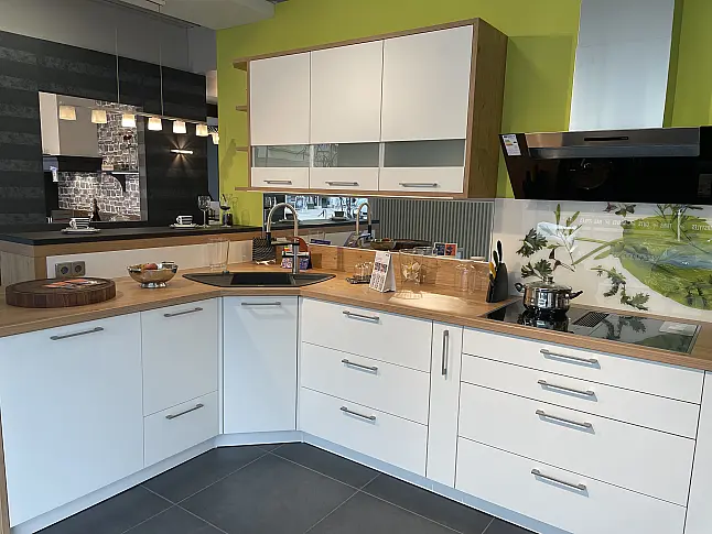 Diese klassische Musterküche ist ein Paradebeispiel für zeitlose Eleganz und harmonisches Design. Die hochwertigen, weißen Fronten verleihen dem Raum eine helle, freundliche Atmosphäre und unterstreichen den Anspruch an klare Formen und stilvolle Zurückhaltung. In Kombination mit der warmen Eiche-Arbeitsplatte entsteht ein reizvoller Kontrast, der Natürlichkeit und Behaglichkeit vermittelt – eine Küche, die gleichermaßen Ruhe und Beständigkeit ausstrahlt.