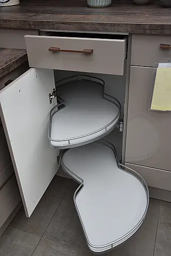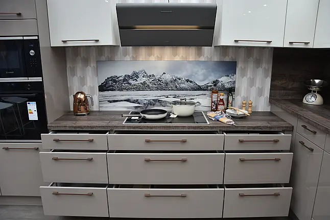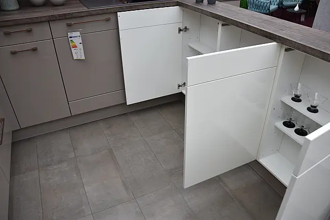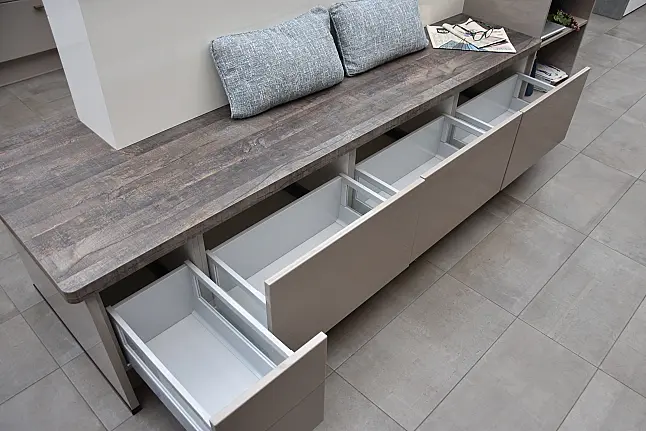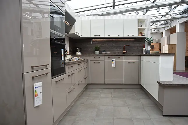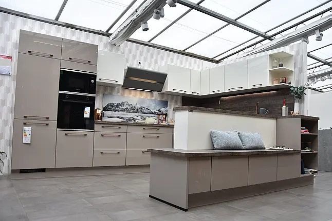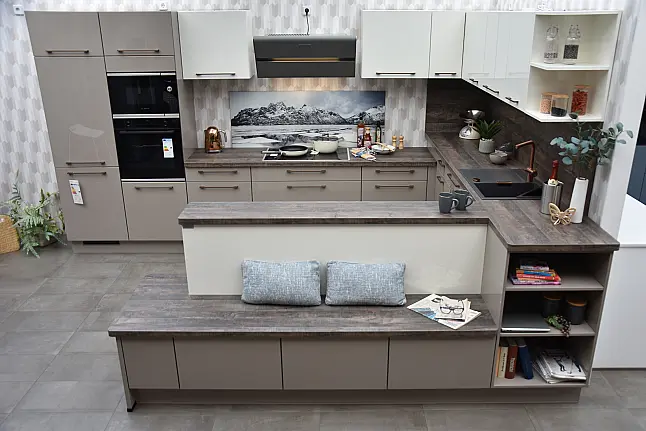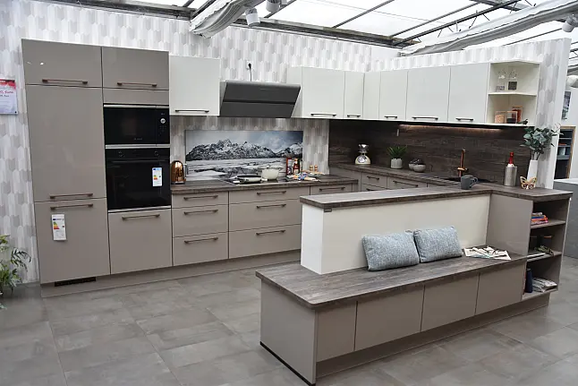 burger Laila 387 Greige Hochglanz lackiert + Laila 383 Silk Hochglanz lackiert Familienküche in U-Form, Hochglanz lackiert mit integrierter Sitzbank und Markengeräten Bosch/Berbel
